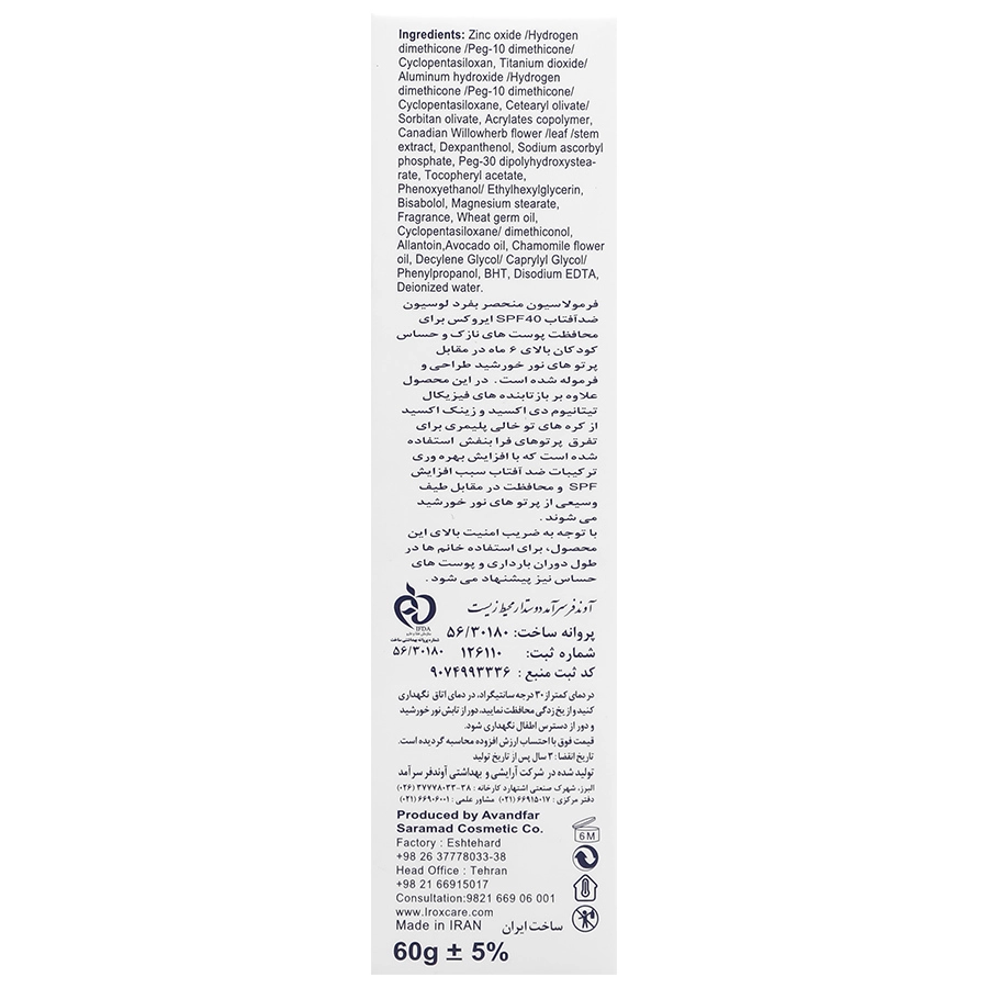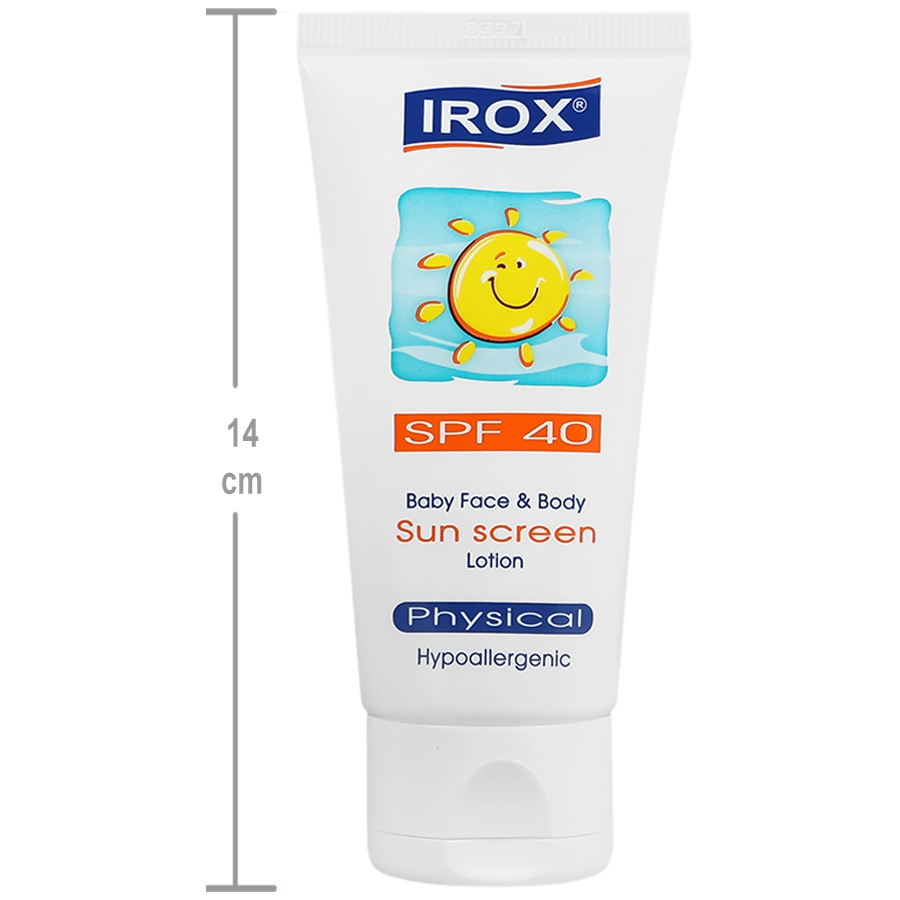 لوسیون ضد آفتاب فیزیکال کودکان ایروکس با SPF40 دارای پخش پذیری مناسب و جذب سریع جهت محافظت پوست صورت و بدن کودکان از اثرات زیانبار نور خورشید می باشد و با استفاده از دی اکسید تیتانیوم و اکسید روی اولترافاین به خوبی طول موج های UV-A و UV-B را پوشش می دهد و با داشتن SPF مناسب بیش از 96% محافظت پوستی برای کودک ایجاد می کند. قابل ذکر است با استفاده از کره های توخالی پلیمری با ابعاد نانو بعنوان افزاینده SPF، نور در سطح پوست پخش و برخورد آن با مواد فعال افزایش می یابد. در این لوسیون ترکیبات ضد التهاب و ضد قرمزی پوست، ترکیبات نرم کننده و مرطوب کننده و روغن ها و عصاره های گیاهی التیام بخش نیز استفاده شده تا این لوسیون یک ضد آفتاب کامل برای پوست حساس این سنین باشد و از ابتدایی ترین علایم آفتاب سوختگی هم جلوگیری نماید.