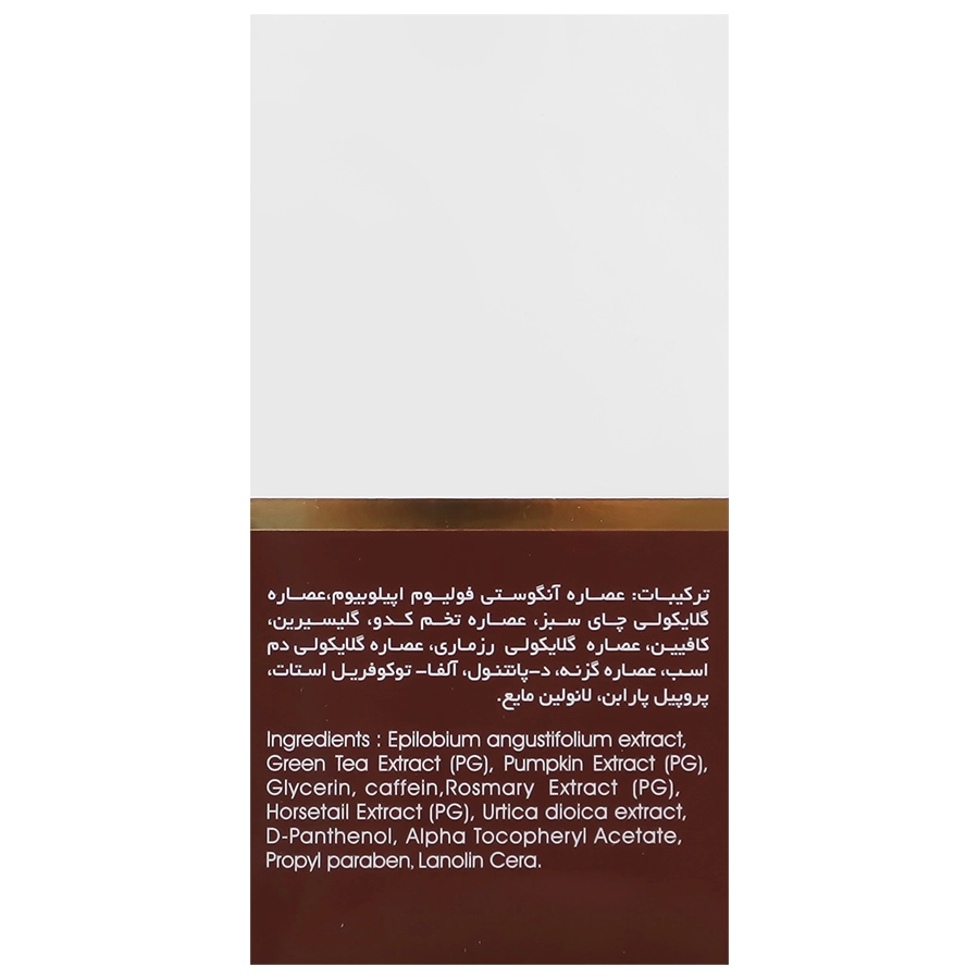حاوی کافئین، روغن ها و عصاره های گیاهی ویتامین E و پیش ساز ویتامین B5