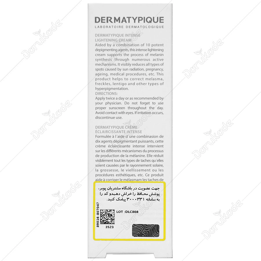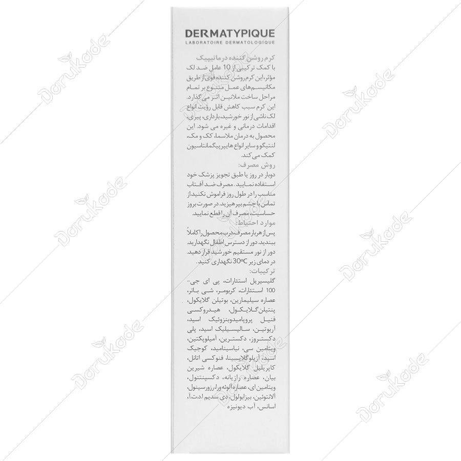 کرم روشن کننده درماتیپیک با کمک ترکیبی از 10 عامل ضد لک موثر، این کرم روشن کننده قوی از طریق مکانیسم های عمل متنوع بر تمام مراحل ساخت ملانین اثر می گذارد. این کرم سبب کاهش قابل رؤیت انواع لک ناشی از نور خورشید، بارداری، پیری، اقدامات درمانی و غیره می شود. این محصول به درمان ملاسما، کک و مک، لنتیگو و سایر انواع هایپرپیگمانتاسیون کمک می کند.