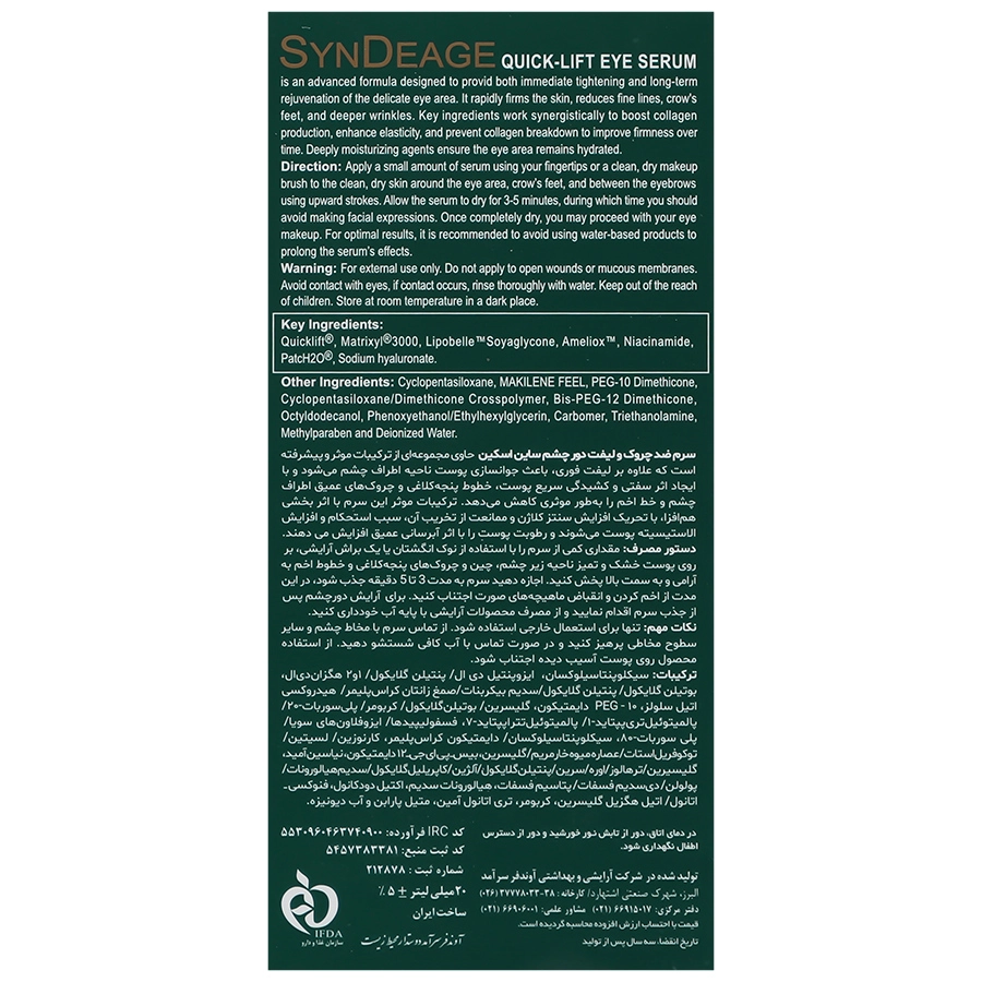 سرم ضد چروک و لیفت دور چشم ساین اسکین حاوی مجموعه ای از ترکیبات موثر و پیشرفته است که علاوه بر لیفت فوری، باعث جوانسازی پوست ناحیه اطراف چشم می شود و با ایجاد اثر سفتی و کشیدگی سریع پوست، خطوط پنجه کلاغی و چروک های عمیق اطراف چشم و خط اخم را به طور موثری کاهش می دهد. ترکیبات موثر این سرم با اثر بخشی هم افزا، با تحریک افزایش سنتز کلاژن و ممانعت از تخریب آن، سبب استحکام و افزایش الاستیسیته پوست می شوند و رطوبت پوست را با اثر آبرسانی عمیق افزایش می دهند.
