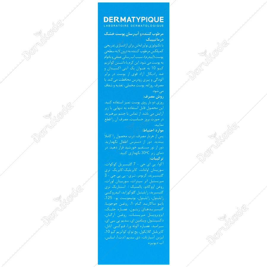 مرطوب کننده و آبرسان پوست خشک درماتیپیک با تکنولوژی نوآورانه اش برای آزادسازی تدریجی کمپلکس مرطوب کننده به درون لایه سطحی پوست (اپیدرم)، سبب آب رسانی عمقی و با دوام به پوست می شود. این کرم با داشتن کوآنزیم کیو 10 به عنوان یک آنتی اکسیدان و ضد رادیکال آزاد قوی از پوست در برابر آلودگی و پیری زودرس محافظت می کند. با مصرف روزانه، پوست مخملی، تغذیه و شفاف می شود.