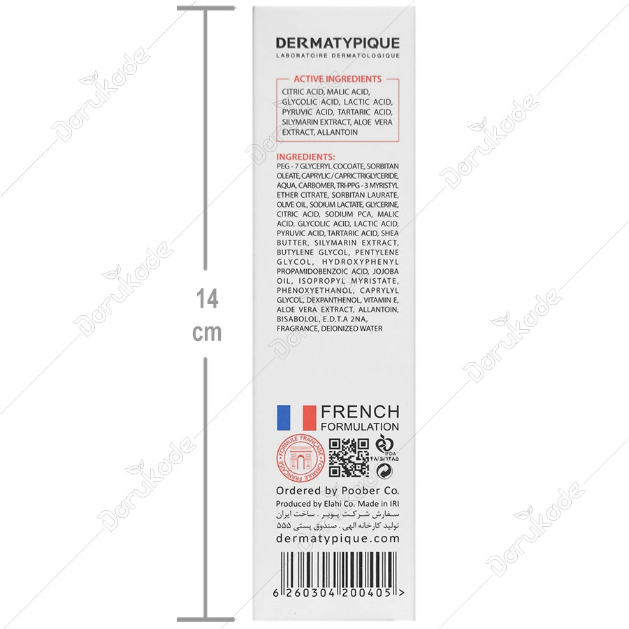 کرم لایه بردار 10% درماتیپیک فرموله شده با ترکیبی از آلفا هیدروکسی اسیدهای معروف در غلظت مناسب و PH متعادل است. کاهش چشمگیری در علائم قابل رؤیت پیری ضمن تضمین سازگاری با هر نوع پوست ایجاد می شود.
