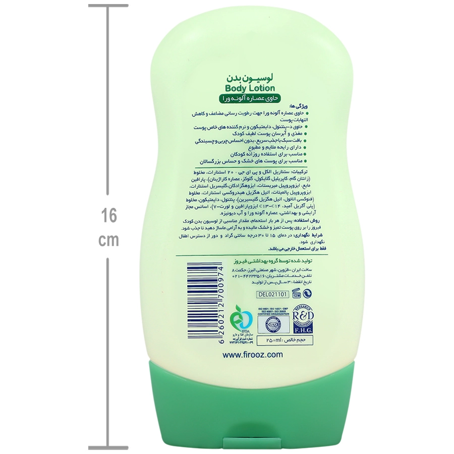 پس از هر بار استحمام، مقدار مناسبی از لوسیون بدن کودک فیروز را بر روی پوست تمیز و خشک مالیده و به آرامی ماساژ دهید تا جذب شود.