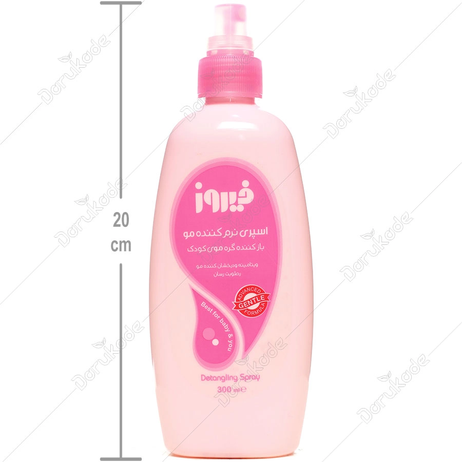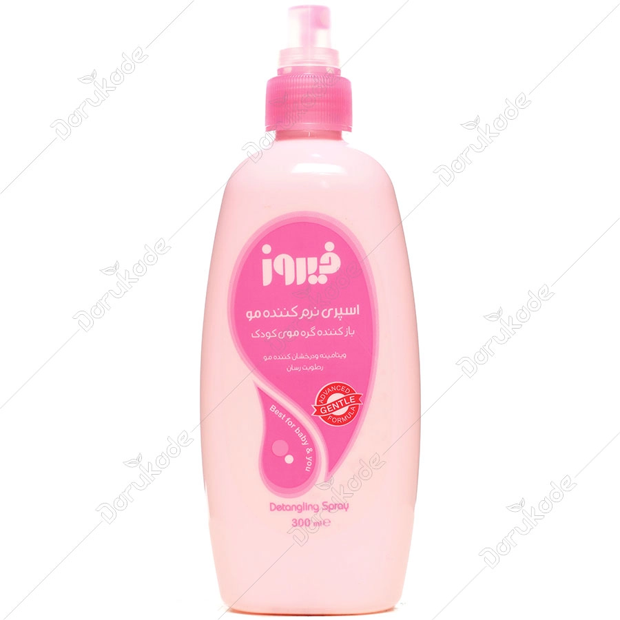 موی نازک کودکان به دلیل ظرافت و نازکی خیلی سریع گره خورده و به هم میپیچند که باز کردن آن گاهی با بیقراری و گریه کودک مواجه میشود. اسپری نرم کنندهی موی فیروز به راحتی گرهی موی کودک را باز کرده و شانه پذیری موهای لطیف و ابریشمی او را راحتتر میکند. این اسپری 300 میلی لیتری با ایجاد لایهای بر روی تارهای مو باعث جدا شدن آنها از هم و باز شدن گرهها میشود و برای کودکانی که دارای موهای بلند و و یا فر و گره خورده هستند فوق العاده موثر است. از خواص دیگر این اسپری حالت دهندگی و حجم دهندگی آن است که میتواند برای افراد بزرگسال هم مورد استفاده قرار گیرد. اسپری نرم کننده موی فیروز میتواند برای انواع موها استفاده شود، اما باید از تماس آن با ریشهی مو اجتناب شود. موهای کودک بعد از استفاده از اسپری مو نیازی به آبکشی ندارند و می توان در حمام و یا بعد از حمام بر روی موی خیس و حتی خشک استفاده شود.
