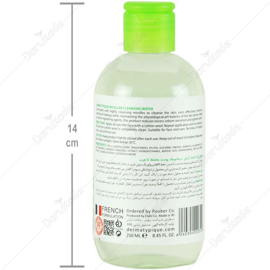 محلول پاک کننده آرایش درماتیپیک پوست مختلط تا چرب با عوامل پاک کننده قوی فرموله شده است تا ضمن حفظ PH فیزیولوژیک، بدون تغییر در تعادل لایه محافظ پوست حتی آرایش ضد آب را پاک کند به کمک عوامل تنظیم کننده چربی، این محصول ترشح اضافی سبوم را کاهش می دهد و منافذ پوست را جمع می کند.