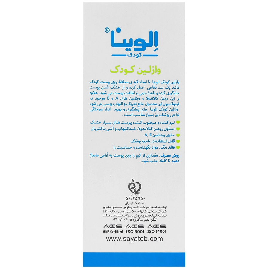 وازلین کودک الوینا با ایجاد لایه ی محافظ روی پوست کودک مانند یک سد دفاعی عمل کرده و از خشک شدن پوست جلوگیری کرده و باعث نرمی و لطافت پوست می شود. علاوه بر این روغن کالاندولا و ویتامین های A و E موجود در فرمولاسیون این محصول مانع تحریک و التهاب پوستی می شود. وازلین کودک الوینا برای پیشگیری و بهبود ادرار سوختگی نواحی پوشک نیز بسیار مناسب است.