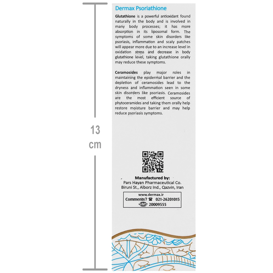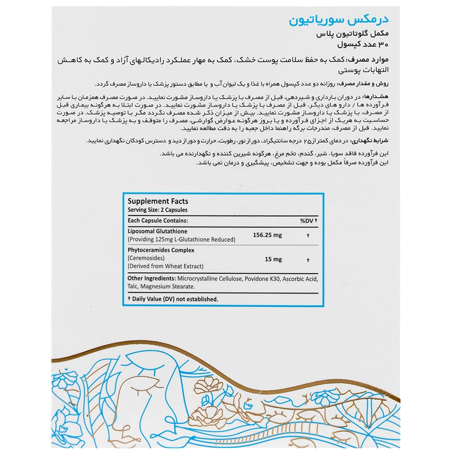 مکمل درمکس سوریاتیون ترکیب منحصر به فردی از دو ماده گلوتاتیون لیپوزومال و سراموزید می باشد که به تحریک سنتز سرامید در پوست کمک کرده و سبب حفظ رطوبت و سلامت سد دفاعی پوست می گردد. این مکمل همچنین از طریق کمک به هیدراته نمودن پوست و خواص ضد التهابی، سبب کمک به کاهش علائم پسوریازیس از قبیل التهاب، خارش و پوسته ریزی می گردد.