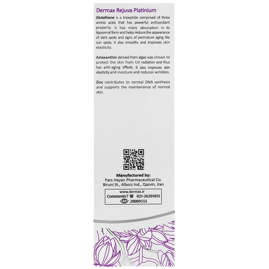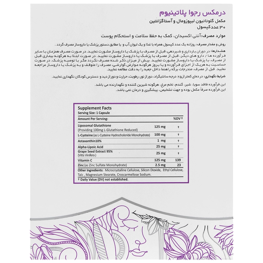 مكمل درمكس رجوا پلاتينيوم تركيب منحصر به فردى از گلوتاتيون ليپوزومال و آستاگزانتين مى باشد. مصرف اين مكمل به محافظت از سلول ها در برابر اكسيداتيو استرس، كاهش چين و چروك و افزايش الاستيسيته پوست كمك مى نمايد، همچنين اين مكمل از طريق كمک به كاهش عملكرد آنزيم تيروزيناز، سبب كاهش لك هاى ناشى از افزيش سن و يكنواخت شدن پوست مى گردد مصرف اين مكمل براى كليه افراد بزرگسال و خصوصا اشخاص بالاى 40 سال توصيه مى گردد.