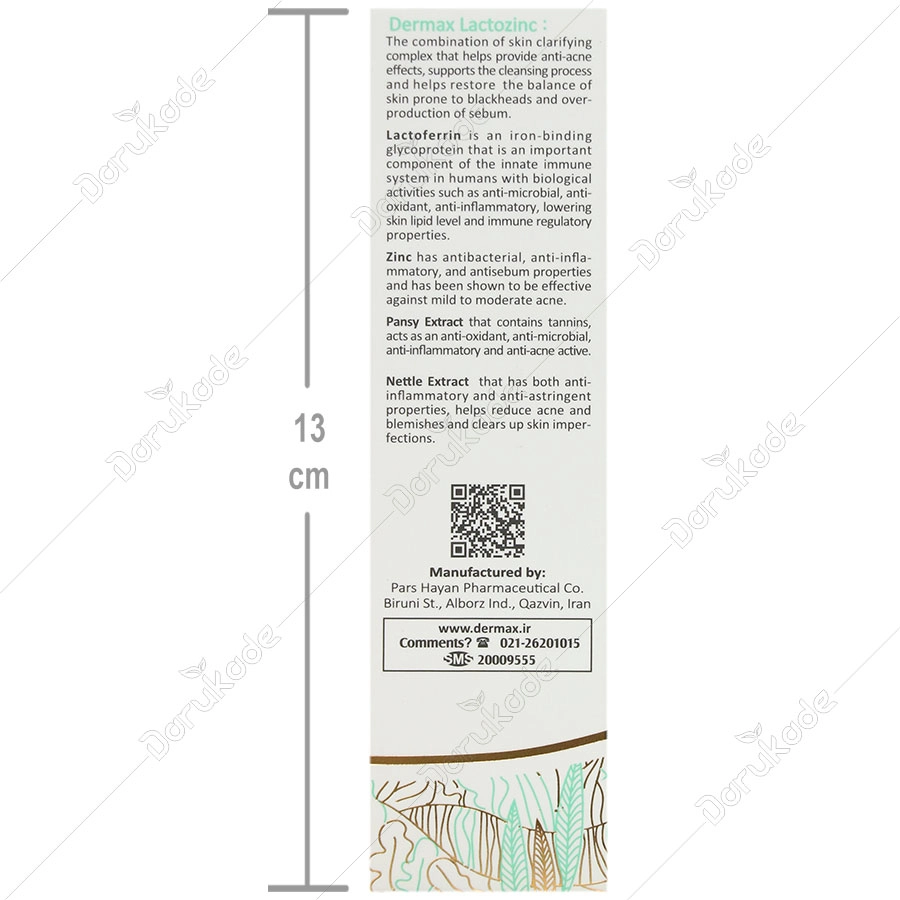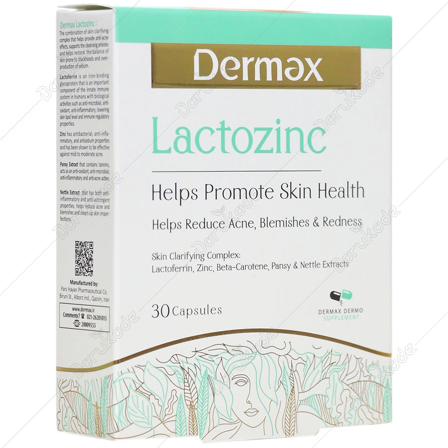 مکمل درمکس لاکتوزینک ترکیبی از مخلوط ویتامین ها، لاکتوفرین، روی، بتاکاروتن و عصاره های گیاهی بوده و جهت کمک به سلامت و پاکسازی پوست و بهبود التهابات ناشی از آکنه، تاثیر بسزایی دارد.