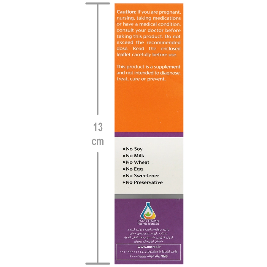 نکات قابل توصیه در دوران بارداری و شیردهی، قبل از مصرف با پزشک یا داروساز مشورت نمایید. در صورت حساسیت به فراورده و یا هر یک از اجزای آن، قبل از مصرف با پزشک مشورت نمایید. در صورت پیدایش هرگونه علائم حساسیت و یا عوارض گوارشی، مصرف فرآورده را قطع نموده و با پزشک مشورت نمایید. مصرف همزمان فراورده با داروهای دیگر ممکن است اثربخشی این مکمل و یا داروی مصرفی را تحت تاثیر قرار داده و سبب تشدید اثرات جانبی گردیده و یا کم شدن یا ازبین بردن تاثیر مکمل بر بدن را به همراه داشته باشد. در صورت مصرف همزمان با سایر فراورده ها/ داروهای دیگر، قبل از مصرف با پزشک یا داروساز مشورت نمایید. در صورت ابتلا به هرگونه بیماری، قبل از مصرف با پزشک یا داروساز مشورت نمایید. بیش از میزان ذکر شده مصرف نگردد مگر با توصیه پزشک. مصرف برای کودکان با توصیه پزشک صورت گیرد. عوارض جانبی این فراورده معمولاً به ندرت و خفیف دیده می شود. مصرف طولانی مدت و بیشتر از میزان توصیه شده این فرآورده ممکن است برخی عوارض جانبی را به همراه داشته باشد. در صورت ادامه یا بدتر شدن عوارض جانبی، مصرف را قطع نموده و با پزشک یا داروساز مشورت نمایید.