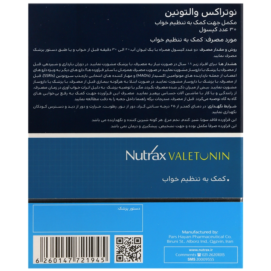 مکمل نوتراکس والتونین ترکیبی از عصاره های گیاهی و اسید آمینه های گابا، تریپتوفان و هورمون ملاتونین می باشد. این فرآورده به منظور کمک به کاهش اختلال خواب، کمک به تنظیم چرخه شبانه روزی خواب، کمک به کاهش مشکلات خواب یا گیجی پس از جراحی، کمک به کاهش اختلال خلقی فصلی (SAD)، کمک به کاهش اختلال خواب ناشی از مسافرت های هوایی (Jet Lag)، کمک به کاهش بی خوابی در افراد مسن و افراد دارای کارهای شیفتی و کمک به کاهش فشارهای عصبی و استرس، مورد استفاده فرار می گیرد.