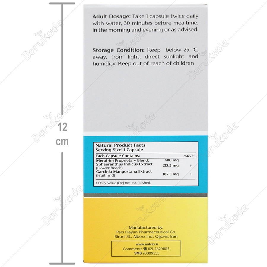 هر کپسول حاوی 400 میلی گرم مراتریم(شامل 212.5 میلی گرم اسفرانتوس ایندیکوس و 187.5میلی گرم گارسینیا منگوستاتا)