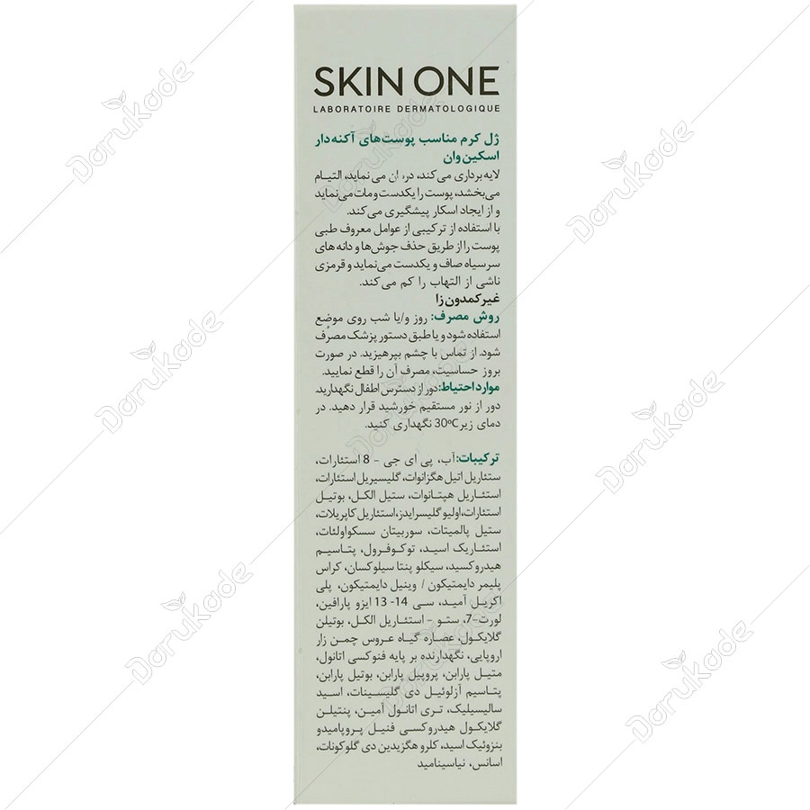 ژل کرم مناسب پوست های آکنه دار اسکین وان: لایه برداری می کند، درمان می نماید، التیام می بخشد، پوست را یکدست و مات می نماید و از ایجاد اسکار پیشگیری می کند. با استفاده از ترکیبی از عوامل معروف طبی پوست را از طریق حذف جوش ها و دانه های سرسیاه صاف و یکدست می نماید و قرمزی ناشی از التهاب را کم می کند.