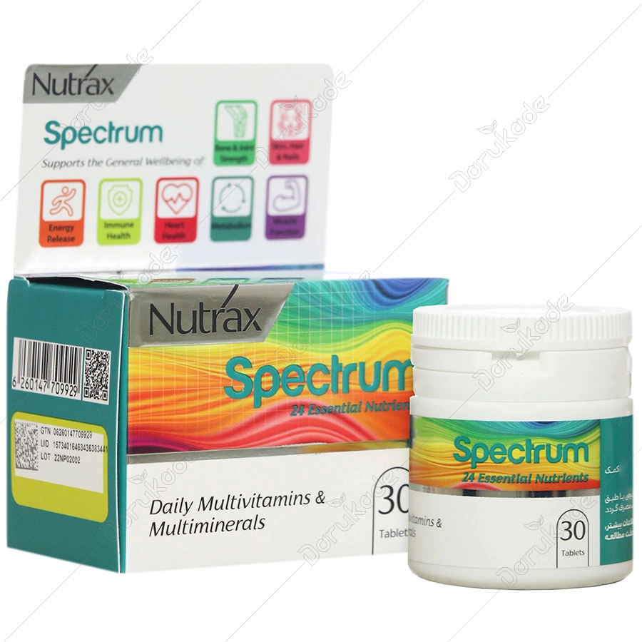 مکمل مولتی ویتامین و مولتی مینرال نوتراکس اسپکتروم حاوی طیف گسترده ای از ویتامین ها و مواد معدنی متعادل شده مناسب برای سلامت بدن انسان می باشد که به صورت طبیعی نیز در مواد غذایی یافت می شود. مصرف مقدار متوازنی از این فرآورده در کنار مواد غذایی، در تامین نیاز های روزانه و ارائه موادی که در رژیم غذایی موجود نیستند و بدن با کمبود این مواد مواجه شده است کمک شایانی نموده و در جبران کمبود برخی مواد هم برای بدن که در اثر بیماری، بارداری، تغذیه نامناسب، اختلالات گوارشی، داروهاث خاص و سایر شرایط پزشکی ایجاد شده اند، مورد استفاده قرار می گیرد.