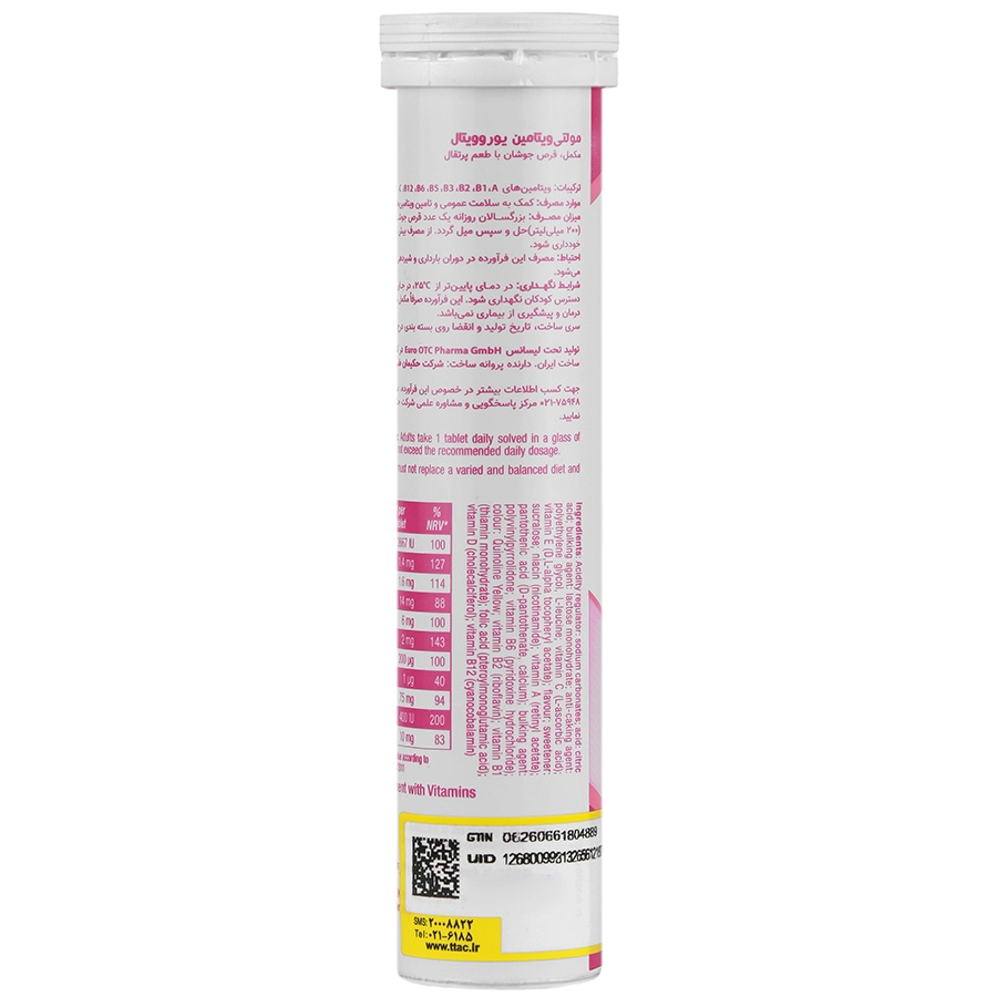 حاوی ویتامین های E ،D3 ،C ،B12 ،B6 ،B5 ،B3 ،B2 ،B1 ،A و فولیک اسید