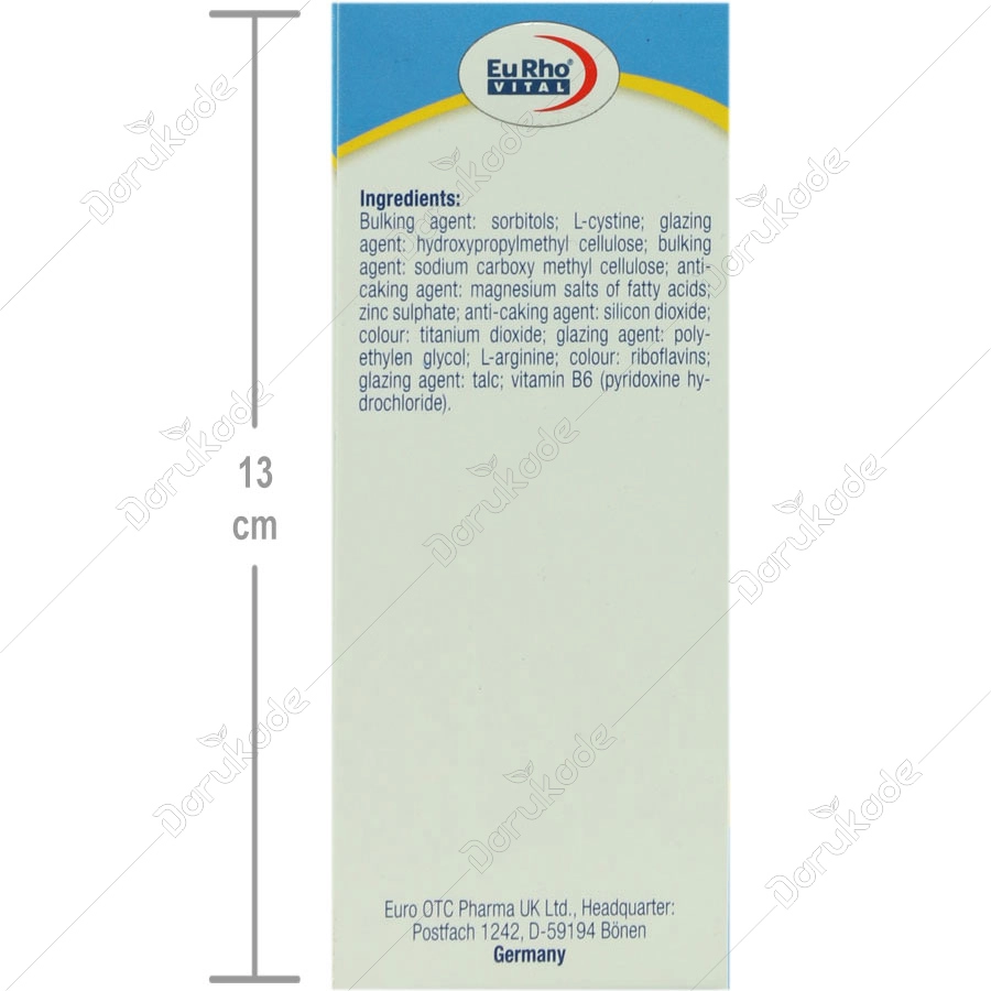 سیستین پلاس یوروویتال تامین کننده ترکیبی متعادل از روی، ویتامین B6، ال-سیستئین و ال-آرژینین می باشد.