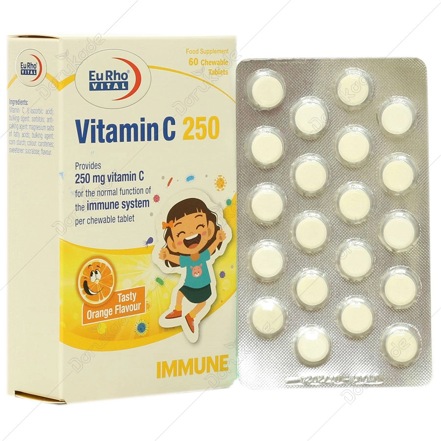 ویتامین C یک ویتامین محلول در آب است و در بدن ذخیره نمی گردد. مقادیر جذب شده توسط بدن دفع می شود و این بدان معناست که تامین آن در بدن به صورت منظم و مداوم مورد نیاز می باشد. قرص های جویدنی ویتامین سی با طعم پرتقال حاوی 250 میلی گرم ویتامین سی در هر قرص می باشد و جایگزین مناسب و آسان برای قرص و کپسول ها است.