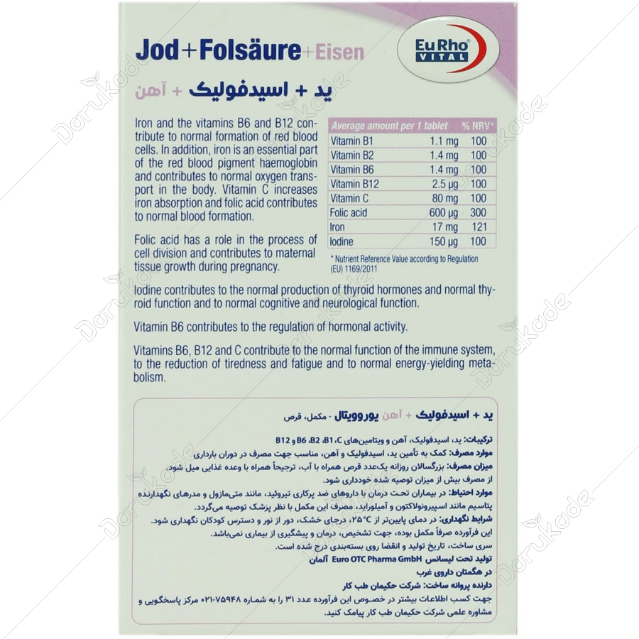 د و فولیک اسید و آهن یوروویتال حاوی مواد مغذی ضروری آهن، ید و فولیک اسید است که مصرف این ترکیبات در دوران بارداری و شیردهی اهمیت بالایی دارد. همچنین این فرآورده حاوی ویتامین های گروه B و ویتامین C می باشد.