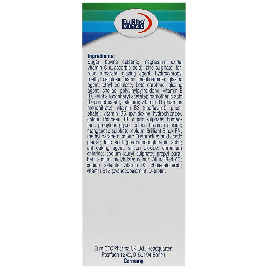 حاوی ویتامین های D3 ،B12 ،B6 ،B5 ،B2 ،B1 ،C ،E، بتاکاروتن، فولیک اسید، نیاسین، بیوتین، آهن، مس، منیزیم، منگنز، کروم، سلنیوم، زینک و مولیبدن