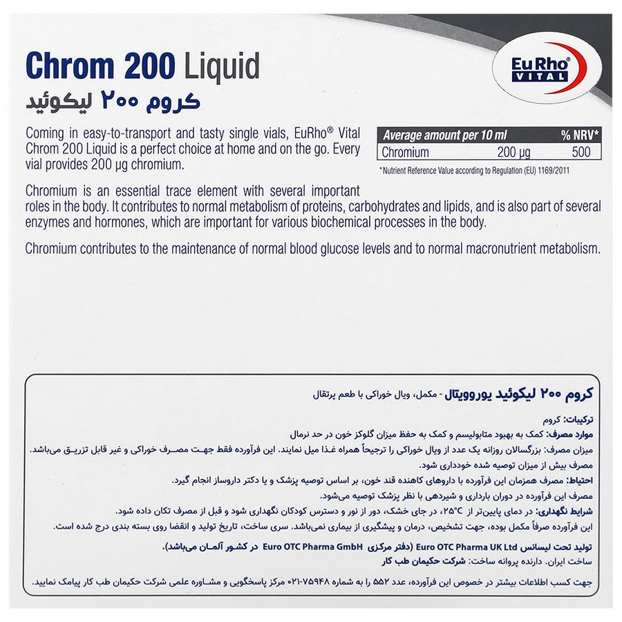 تنظیم قند خون و متابولیسم کربوهیدرات، پروتئین و چربی نقش مهمی در پیشگیری از بروز بیماریهای متابولیک (دیابت، چاقی و افزایش چربی خون) ایفا میکند. کروم یکی از مواد معدنی ضروری جهت تقویت عملکرد انسولین، تنظیم متابولیسم درشت مغذیها و در نتیجه حفظ سلامت بدن است. مصرف مکمل کروم اثرات مثبتی در پیشگیری و درمان دیابت نوع 2، اضافه وزن و چاقی، سندروم تخمدان پلیکیستیک (PCOS) و افزایش چربیهای خون دارد. ویال خوراکی کروم یوروویتال حاوی 200 میکروگرم کروم میباشد.