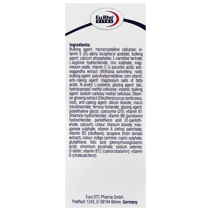 حاوی ویتامینها و مواد معدنی، اینوزیتول، گلوتاتیون، ال-کارنیتین، کوآنزیم کیوتن، ال-آرژینین، ان-استیل ال-سیستئین، لیکوپن، عصاره جینسینگ و آشواگاندیا (جینسینگ هندی)