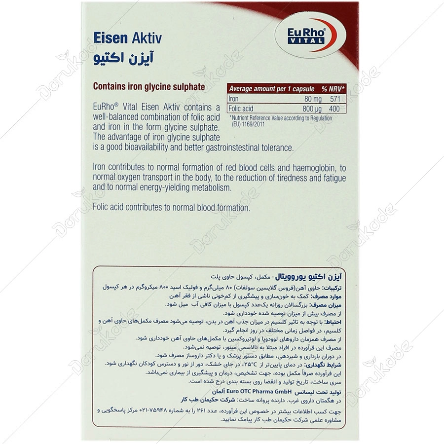 حاوی آهن (فروس گلایسین سولفات) 80 میلی گرم و فولیک اسید 800 میکروگرم در هر کپسول