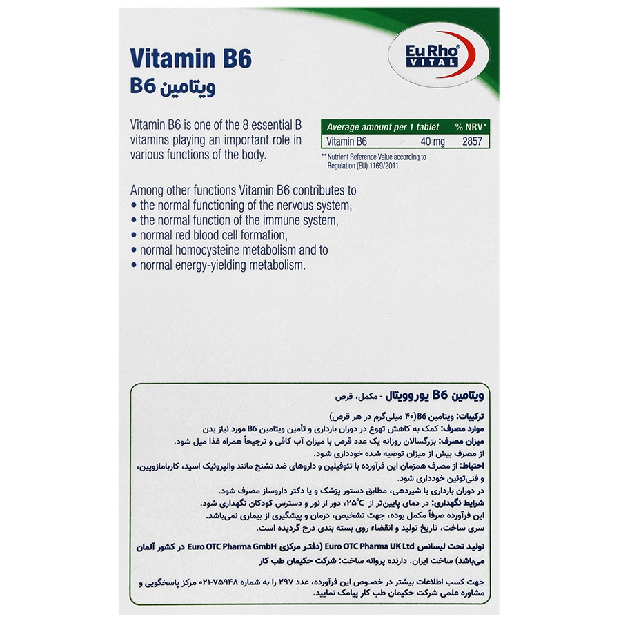 قرص ویتامین B6 یوروویتال حاوی 40 میلیگرم B6، در درمان کمبود این ویتامین، حفظ سلامت سیستم عصبی و افزایش سطح انرژی موثر بوده و باعث بهبود بیماریهای زیر میشود: