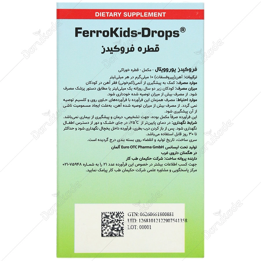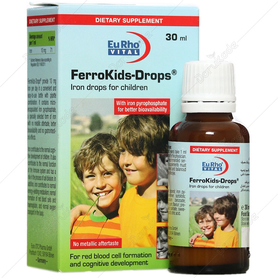 قطره فروکیدز یوروویتال، مکمل غذایی حاوی آهن (به صورت ملح پیروفسفات) برای تشکیل گلبول های قرمز خون و تکامل سیستم ادراکی وحافظه در کودکان می باشد. قطره آهن فروکیدز تامین کننده آهن به میزان 10 میلی گرم روزانه می باشد.