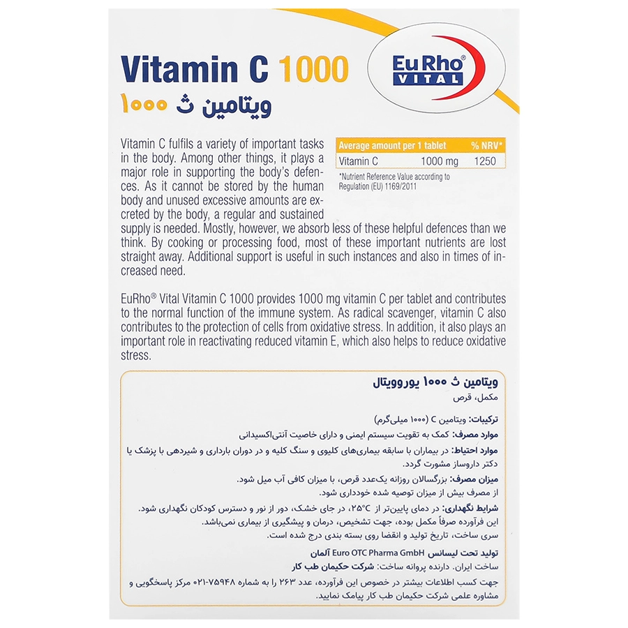 ویتامین C 1000 یوروویتال تامین کننده 1000 میلی گرم ویتامین C در هر قرص می باشد و در تقویت عملکرد طبیعی سیستم ایمنی موثر است. ویتامین C به عنوان یک عامل آنتی اکسیدان و مهار کننده رادیکال های آزاد، می تواند سلول ها را در برابر استرس اکسیداتیو محافظت نماید. علاوه بر این، نقش مهمی در فعال سازی مجدد ویتامین E احیا شده دارد که این هم می تواند در کاهش استرس اکسیداتیو موثر باشد.