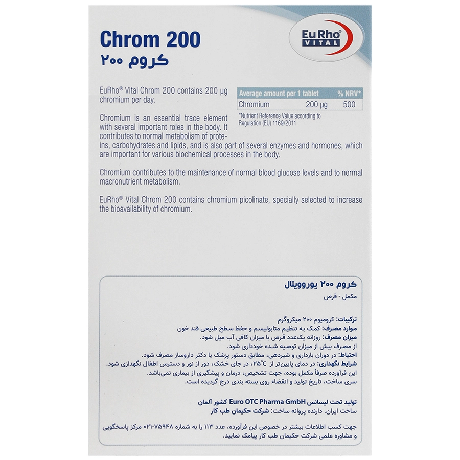 کروم 200 یوروویتال حاوی 200 میکروگرم کرومیوم پیکولینات است که به طور موثری در افزایش میزان جذب کروم موثر می باشد.