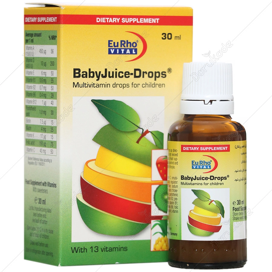 قطره بیبی جویس یوروویتال حاوی ترکیبی متعادل از 13 نوع ویتامین در بسته بندی مناسب، همراه قطره چکان می باشد. ویتامین D برای رشد ونمو طبیعی استخوان ها در کودکان مورد نیاز می باشد. ویتامین های D، C، B6، B12، A و فولیک اسید در عملکرد طبیعی سیستم ایمنی موثر می باشند. ویتامین های گروه B به متابولیسم انرژی و کاهش خستگی و ضعف کمک می کنند. به علاوه ویتامین D، A و فولیک اسید در فرآیند تقسیم و تمایز سلولی نقش دارند.