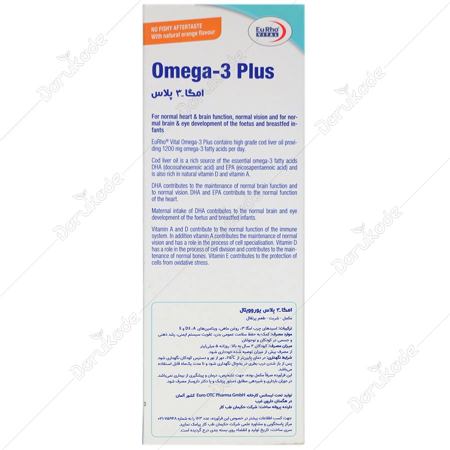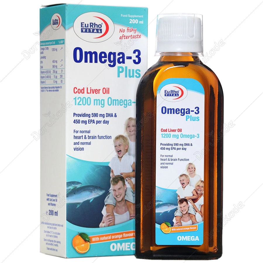 امگا-3 پلاس یوروویتال حاوی مقدار بالایی از روغن کبد ماهی می باشد که روزانه 1200 میلی گرم اسیدهای چرب امگا-3 را تامین می کند. روغن کبد ماهی منبع غنی از اسیدهای چرب امگا-3 ضروری، DHA (اسید دوکوزاهگزانوئیک) و EPA (اسید ایکوزاپنتانوئیک) و همچنین سرشار از ویتامین D طبیعی و ویتامین A است.