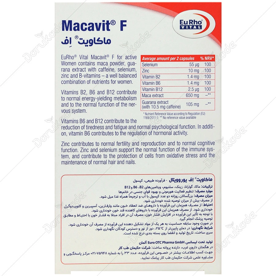 ماکاویت F یوروویتال حاوی عصاره گیاه ماکا، عصاره گوارانا، سلنیوم، روی و ویتامین های گروه B می باشد که یک ترکیبی متعادل از مواد مغذی برای خانم ها می شود.