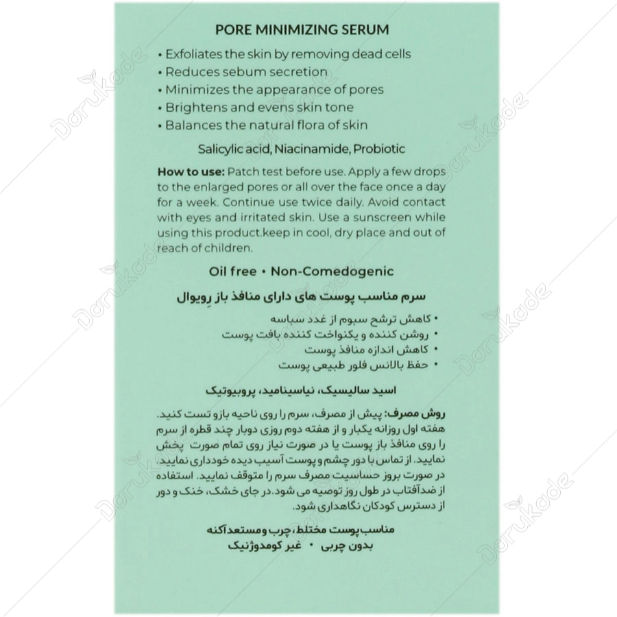 هفته اول روزانه یکبار و از هفته دوم روزی دوبار چند قطره از سرم را روی منافذ باز پوست یا در صورت نیاز روی تمام صورت پخش نمایید.