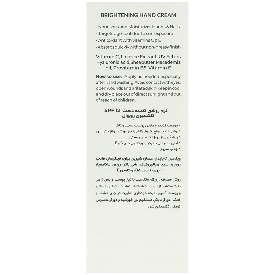 حاوی ویتامین C پایدار، عصاره شیرین بیان، فیلترهای جاذب یووی، اسید هیالورونیک، شی باتر، روغن ماکادمیا، پروویتامین B5، ویتامین E