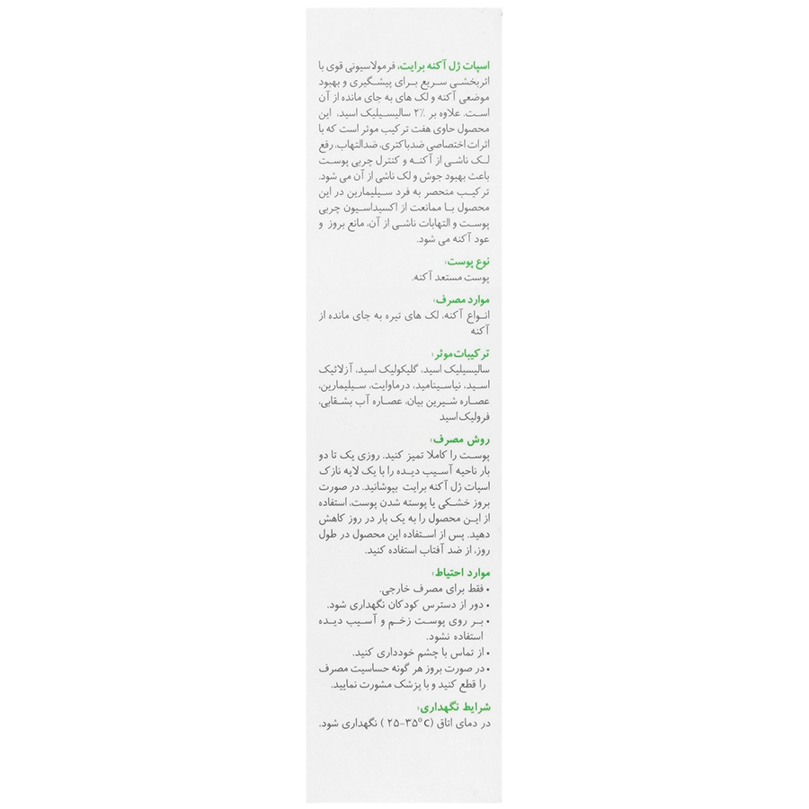 فرمولاسیونی قوی با اثربخشی سریع برای پیشگیری و بهبود موضعی آکنه و لک های به جای مانده از آن است. علاوه بر 2% سالیسیلیک اسید این محصول حاوی هفت ترکیب موثر است که با اثرات اختصاصی ضد باکتری، ضد الهاب، رفع لک ناشی از آکنه و کنترل چربی پوست باعث بهبود جوش و لک ناشی از آن می شود.