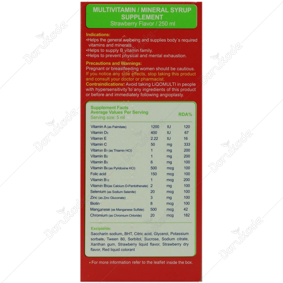 تداخل دارویی: در صورت مصرف هرگونه دارو، قبل از مصرف با پزشک و یا داروساز مشورت نمایید. مصرف همزمان ویتامین های A و D3 در کنار شربت لیکو مولتی می تواند باعث افزایش شدید دوز ویتامین A و D3 در بدن شود.