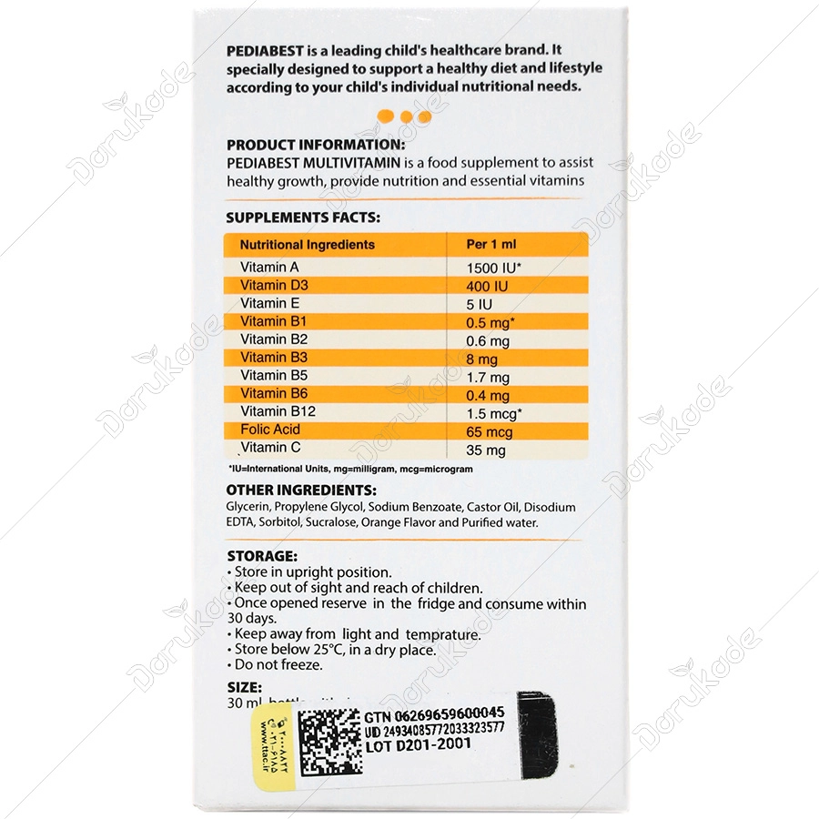 قطره مولتی ویتامین پدیابست یک مکمل غذایی برای کودکان در جهت رشد سالم و تامین ویتامین های ضروری آن هاست. این محصول با داشتن رنج وسیعی از ویتامین ها و البته فرمولاسیون جامع و دقیق انتخابی مناسب برای جلوگیری از فقر کودکان به مواد مغذی می باشد.