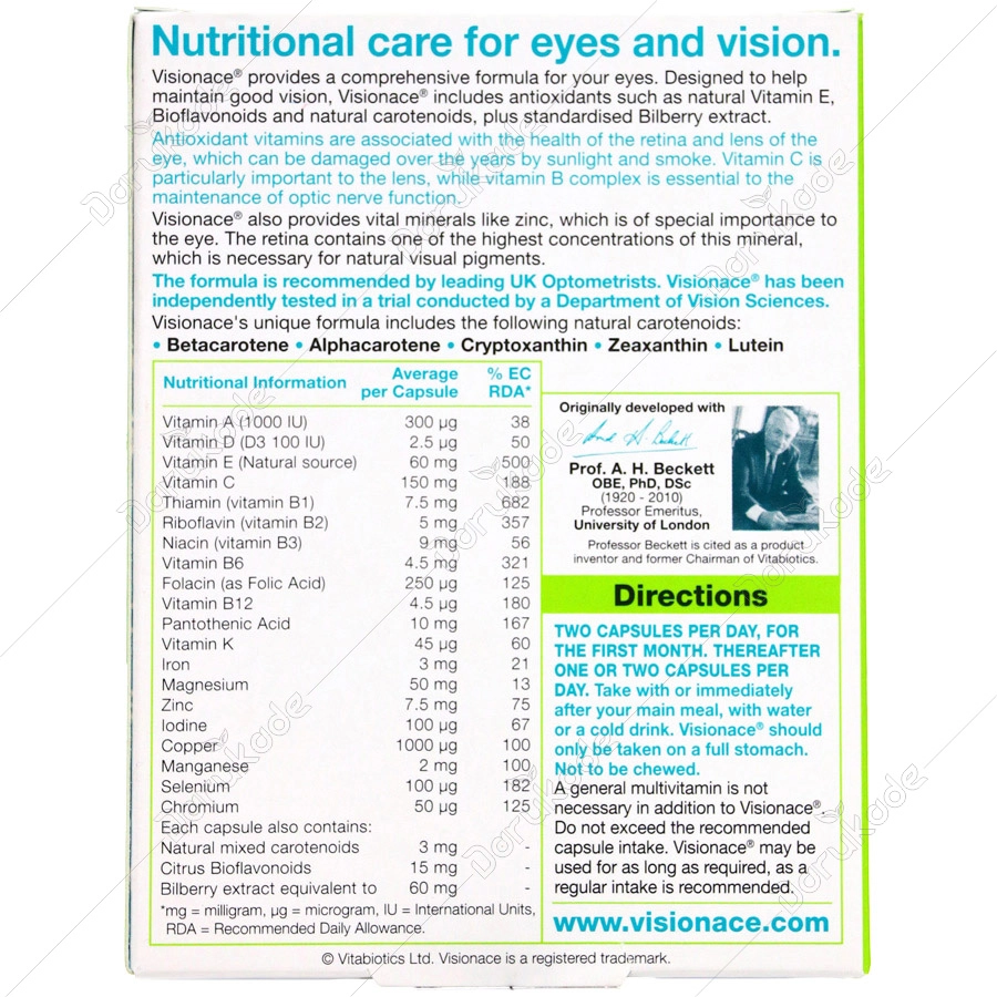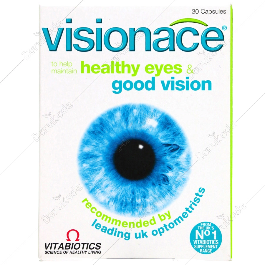 محافظت از چشم در برابر آسیب های محیطی روزانه : عوامل آسیب رسان مانند نور خورشید ، آلودگی هوا و ... باعث تولید ترکیبات زیان آوری به نام رادیکال های آزاد شده و به سلامت سلول های سیستم بینایی آسیب می رسانند . مولتی ویتامین Visionace حاوی مقادیر قابل توجهی از جمله ویتامین ها و آنتی اکسیدان های طبیعی مانند ویتامین E و C و سلنیوم و کاروتنوئید ها ( رنگدانه های گیاهی مانند لوتئیین و زاگزانتین ) است که از سیستم بینایی محافظت می کند . کمک به پیشگیری از آب مروارید : مواد آنتی اکسیدان موجود در مولتی ویتامین Visionace از جمله ویتامین های C , E ، سلنیوم و کاروتنوئید ها ( رنگدانه های گیاهی ) به محافظت از عدسی چشم در برابر عوامل آسیب رسان مثل نور خورشید کمک کرده و خطر ابتلا به آب مروارید ، خصوصا در دوران سالمندی را کاهش می دهند . کمک به پیشگیری از تحلیل شبکیه چشم ناشی از کهولت سن : ( AMD ) Visionace با داشتن ترکیباتی نظیر لوتئین سبب فیلتراسیون پرتوهای مضر برای شبکیه چشم شده و از تحلیل آن در اثر کهولت سن جلوگیری می کند . خون رسانی و تغذیه بافت های چشم : مولتی ویتامین Visionace دارای ویتامین هایی نظیر B12 , B6 , اسید فولیک و عصاره گیاه Bilberry است که به سلامت عروق خونی چشم خصوصا در افراد دیابتی کمک کرده و باعث بهبود خونرسانی به بافت های چشم می شود . تامین رطوبت کافی و پیشگیری از خشکی چشم : Visionace حاوی ویتامین های E , C , A است که همگی برای تولید اشک ضروری هستند . بدین طریق به حفظ رطوبت طبیعی چشم کمک کرده و برای افرادی که از لنزهای چشمی استفاده می کنند ، کسانی که به مدت طولانی به صفحه کامپیوتر نگاه می کنند و همچنین سالمندان مفید خواهد بود . ویتامین E : ویتامین E متشکل ازهشت آنتی اکسیدان است که مهمترین آنها ، آلفاتوکوفرول می باشد و تنها شکلی از ویتامین E است که بطور فعال در بدن انسان ساخته می شود . ویتامین E در همه بافت های بدن ذخیره گشته و این ذخایر بافتی می تواند در مقابل کمبود این ویتامین، مقاومت نشان دهد . این ویتامین جهت انجام عملکردطبیعی تولید مثلی ، باروری و افزایش قدرت جنسی مردانه بسیار موثر است . ویتامین E مانع تخریب اسیدهای چرب اشباع نشده، هورمون های جنسی و ویتامین های محلول در چربی توسط اکسیژن گشته و موجب گشاد شدن مویرگ ها شده و جریان خون به بافت عضلانی را افزایش می دهد. لخته های خون را حل کرده و مانع از تشکیل آنها می شود. ولی در انعقاد طبیعی خون بی تأثیر است. موجب افزایش ادرار نیز می گردد . ویتامین E در رطوبت ، نرمی و لطافت پوست نیز موثر است و خاصیت محافظت کنندگی در برابر نور آفتاب دارد . کمبود ویتامین E منجر به تغییرات تخریبی در مویرگ های خونی و نهایتاً بیماری های قلبی و کبدی می گردد . کمبود این ویتامین در مغز نیز بسیار تأثیر گذاشته و قدرت جنسی را تا حد زیادی کاهش می دهد . کمبود دراز مدت ویتامین E موجب بروز اختلالات تولید مثلی ، سقط جنین ، ناباروری و اختلالات عضلانی نیز می گردد . پیریدوکسین ( ویتامینB6 ) : پیریدوکسین ماده ای سفید رنگ و کریستالی است که در آب و الکل محلول می باشد . همچنین باکتریهای موجود در کولون یا روده بزرگ ، این ویتامین را سنتز می کنند . جذب آن به میزان بسیار کمتری صورت گرفته و ذخیره آن نیز در بدن بسیار محدود می باشد . این ویتامین به طور وسیعی در بسیاری از بافتهای بدن توزیع شده و ازطریق کلیه ها دفع می گردد . پیریدوکسین یا ویتامین B6 ، در جذب غذا و پروتئین و متابولیسم چربی مخصوصا در متابولیسم اسیدهای چرب ضروری بدن نقش دارد . این ویتامین بسیاری از آنزیم ها و سیستم های آنزیمی بدن را فعال می کند . این ویتامین در حفظ عملکرد سیستم عصبی و مغزنیز نقش دارد و برای عملکرد طبیعی تولید مثل و بارداریهای مطلوب مورد نیاز است . در پیشگیری از ایجاد اختلالات پوستی و عصبی با محافظت از بدن در برابر کلسترول بالا ، بعضی از انواع بیماریهای قلبی و دیابت وتخریب دندان نقش دارد . ویتامین B6، باعث تنظیم تعادل میان سدیم و پتاسیم در بدن می گردد که جهت عملکرد طبیعی بدن مورد نیاز 