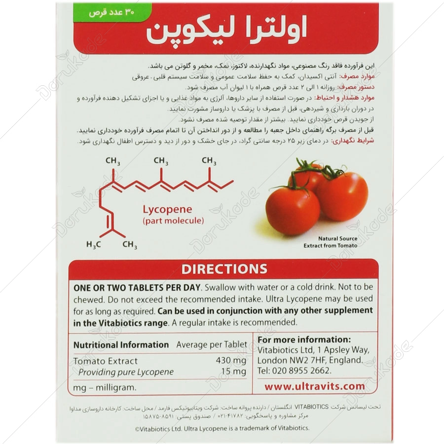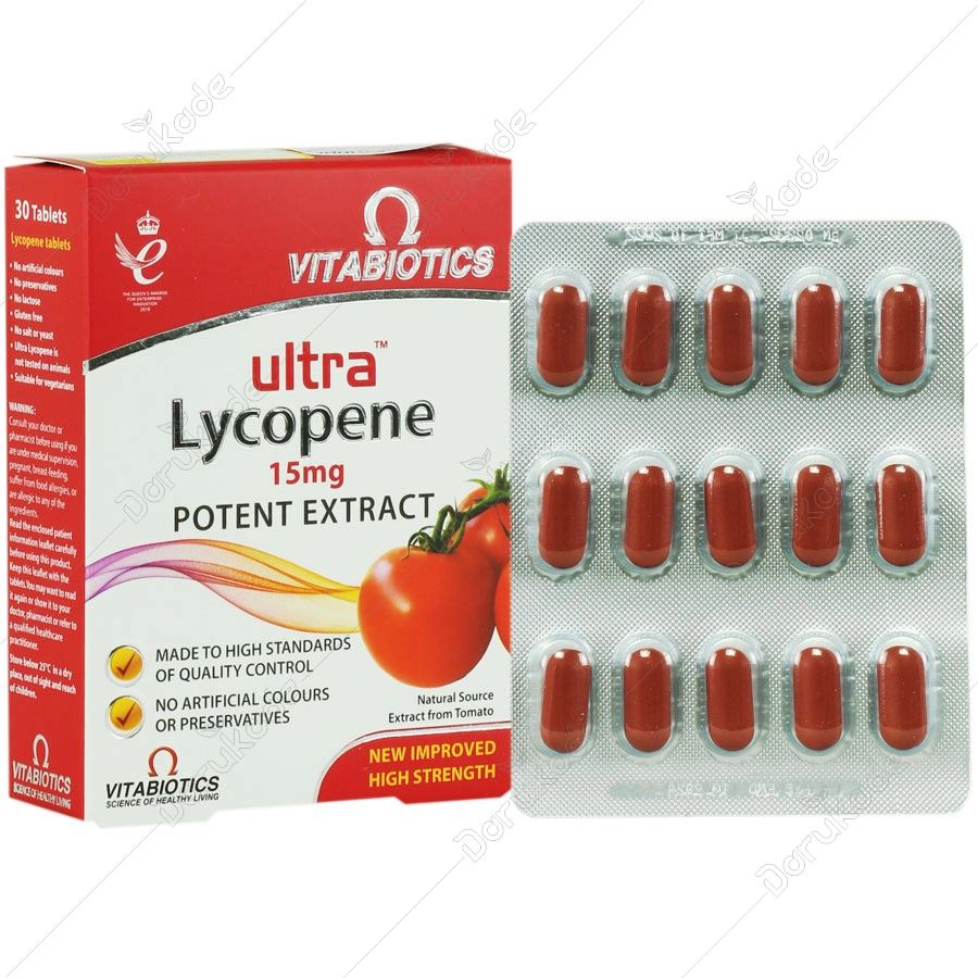 قرص اولترا لیکوپن حاوی 200 میلی گرم عصاره گوجه فرنگی که تامین کننده 15 میلی گرم لیکوپن خالص است. لیکوپن ماده ای است که در بدن ساخته نمی شود و باید از طریق غذا در یافت شود.