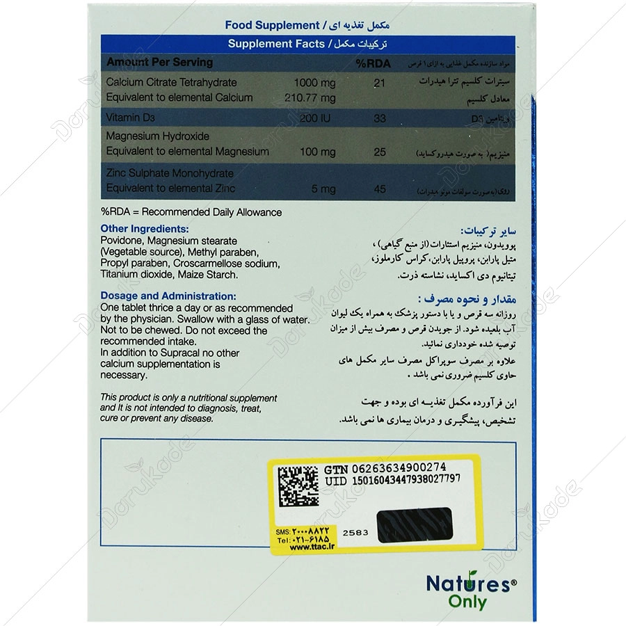 | کلسیم سیترات تتراهیدرات | 1000 mg |