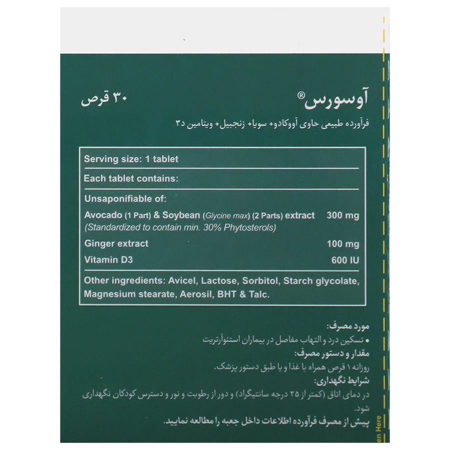 آوسورس یک فراورده طبیعی حاوی عصاره اووکادو و سویا و زنجبیل همراه با ویتامین د3 می باشد. تحقیقات نشان می دهد که ترکیب آووکادو و سویا، اثر ضد استئوآرتریت دارد و می تواند با مهار تولید واسطه های التهابی مانند پروستاگالاندین E2 و اینترلوکین 1 و کاهش التهاب در مفاصل به عنوان یک داروی تسکین دهنده مورد توجه قرار گیرد. همچنین فعالیت ضد التهابی زنجبیل با مهار فعال سازی ماکروفاژ و نوتروفیل ها و همچنین تاثیر منفی بر مهاجرت مونوسیت ها و لکوسیت ها انجام می شود. مطالعات کلینیکی نشان می دهد که مصرف عصاره زنجبیل می تواند سبب بهبود درد در بیماران مبتلا به استئوآرتریت شود.