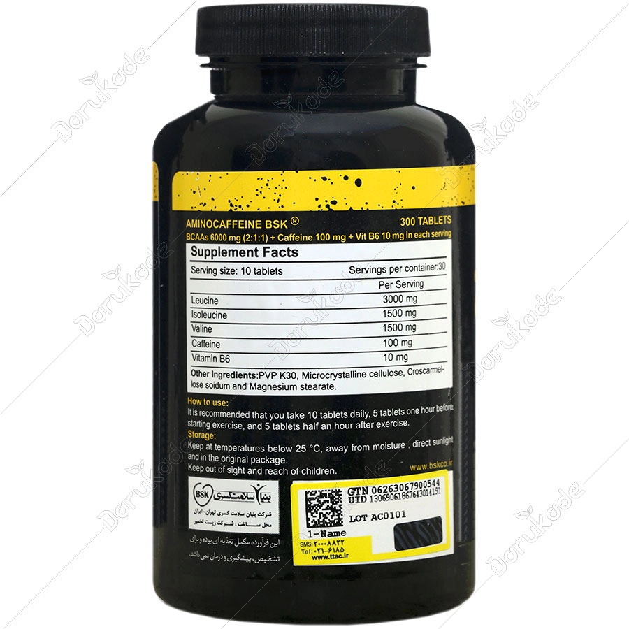 حاوی 6000 میلی گرم BCAAs با نسبت (2:1:1) و 100 میلی گرم کافئین و 10 میلی گرم ویتامین B6 در هر 10 قرص