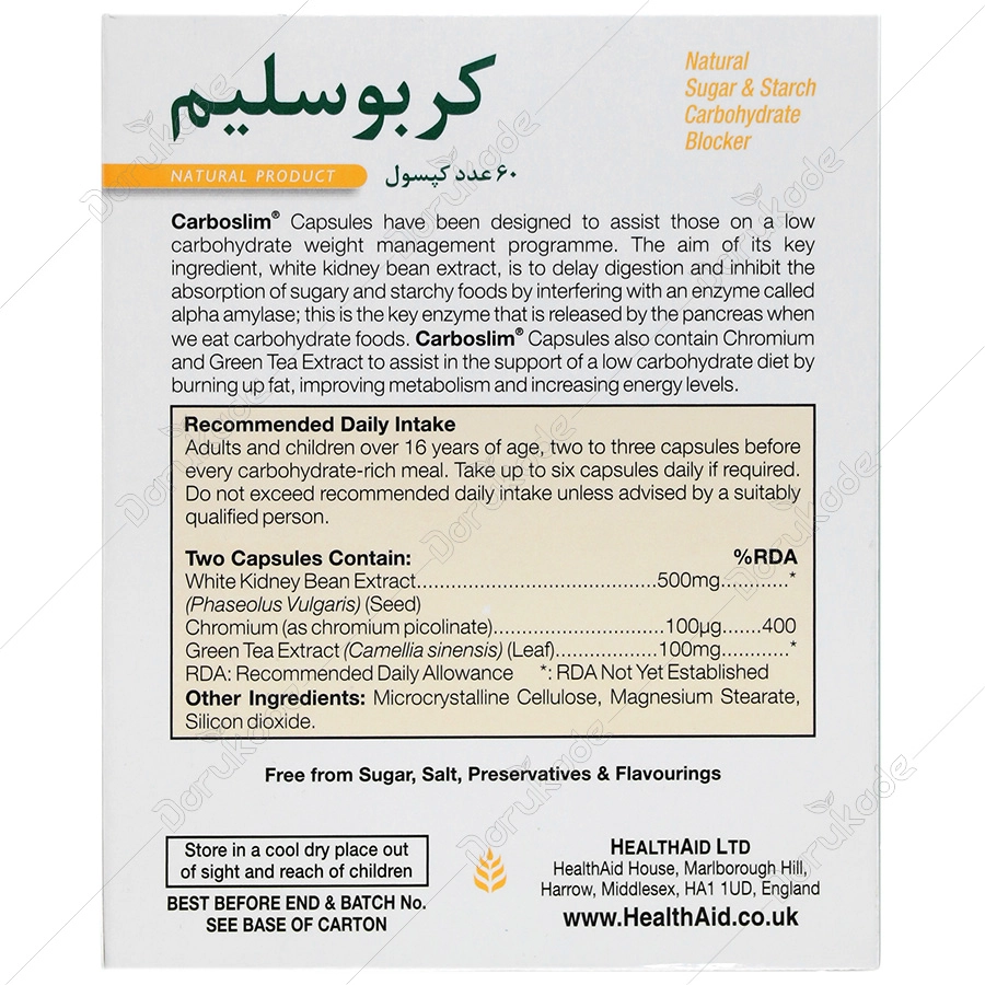 کپسول Carboslim کمپانی Health Aid، ترکیبی کاملاً طبیعی و ویژه از عصاره لوبیای قرمز (فاز2)، عصاره چای سبز و عنصر کروم است که از طریق مهار ترشح آنزیم هضم کننده کربوهیدرات ها، مانع از جذب آن ها شده و به کاهش وزن بدون عوارض جانبی کمک می کند.