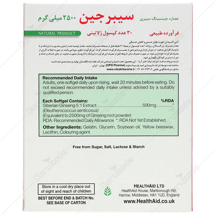 مکمل سیبرجین شرکت هلث اید، حاوی معادل 2500 میلی گرم جینسینگ سیبری استاندارد شده می باشد و سبب افزایش سطح انرژی بدن می شود. جینسنگ سیبری، سازگار و مقوی با خواص آنتی اکسیدانی بالا است و حاوی نیاسین، اسیدهای آمینه، کربوهیدرات و سایر ویتامین ها و مواد معدنی نیز می باشد که برای افزایش سلامت کلی بدن مردان و زنان در تمام سنین بسیار موثر بوده و سبب افزایش گردش خون در بدن، تقویت سیستم ایمنی، افزایش انرژی و استقامت فیزیکی بدن و رفع خستگی می گردد.