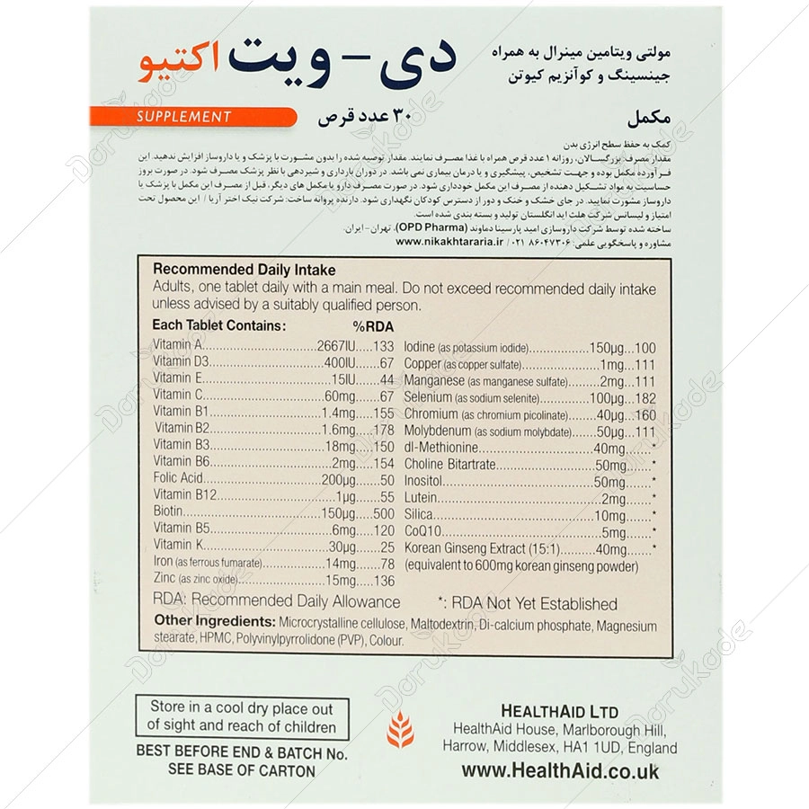 قرص Day Vit Active کمپانی Health Aid، ترکیب متعادلی از ویتامین ها، مواد معدنی، اسیدهای آمینه، کوآنزیم Q10 و جینسینگ است، که برای بهبود و حفظ سلامتی و شادابی بدن فرموله شده است. این ترکیب ویژه تأمین کننده 100% نیاز روزانه به ویتامین های A ،D ،C ،E ،K و ویتامین های گروه B می باشد، علاوه برآن حاوی مواد معدنی مورد نیاز برای سلامت بدن شامل: روی، آهن، سلنیم، کلسیم، کلر، پتاسیم، فسفر، منیزیم، ید، منگنز، مس، کروم و مولیبدنیوم بوده و همچنین اسید آمینه متیونین و ترکیبات ویژه دیگر نظیر: کولین، اینوزیتول، لوتئین، سیلیکا، کوآنزیم Q10 و جینسینگ برای اثربخشی بیشتر و بهتر به آن افزوده شده اند.