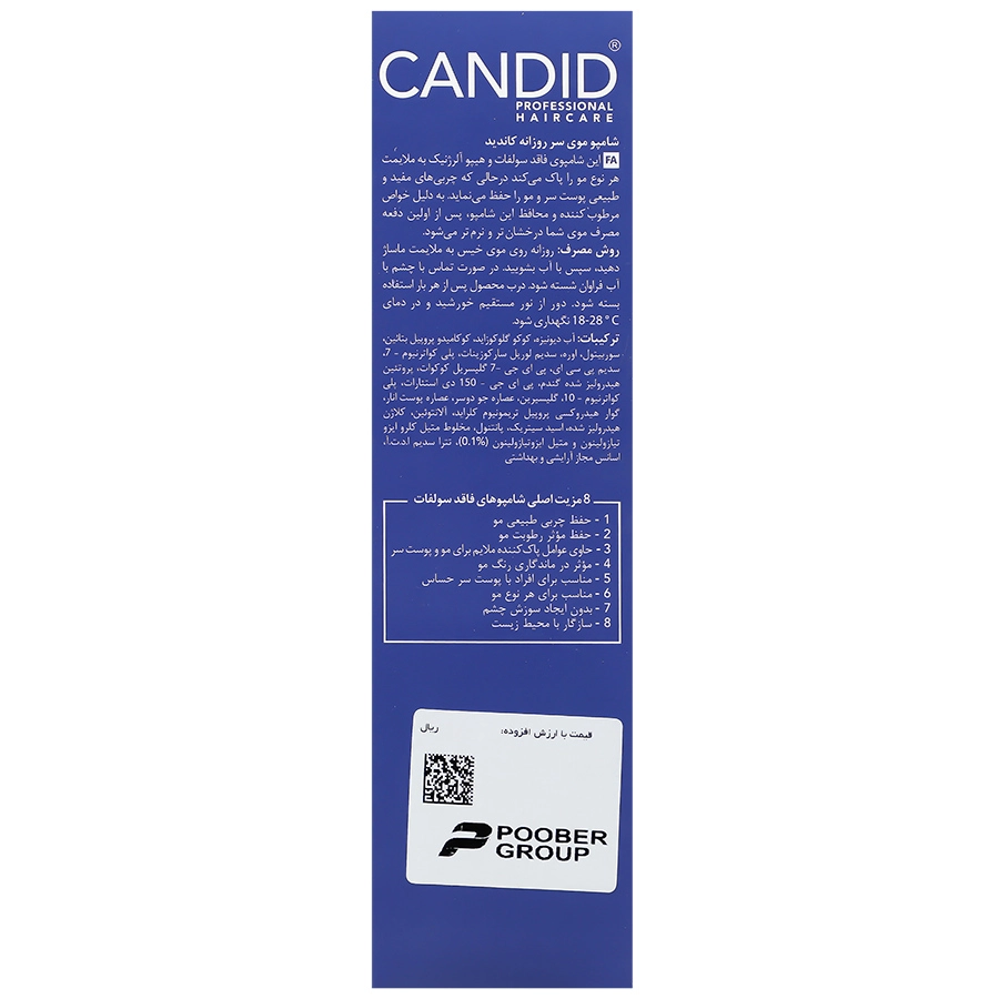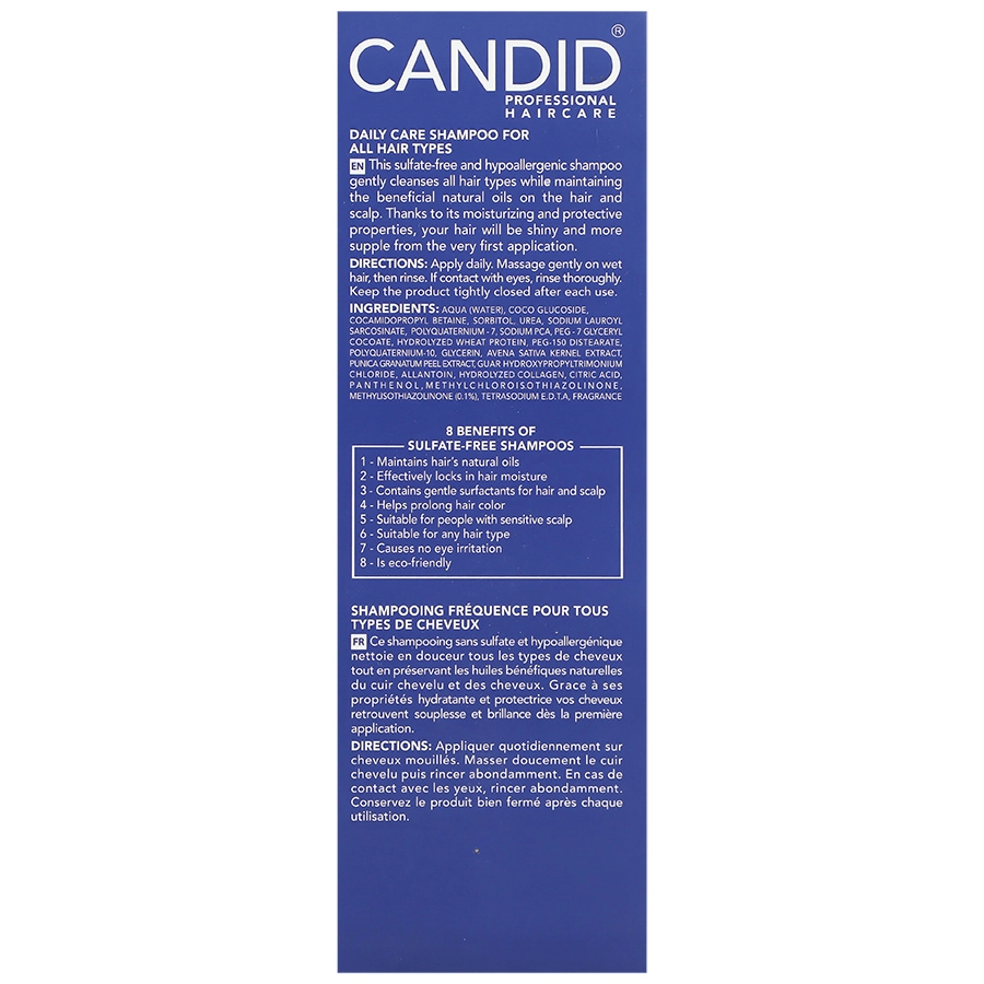 شامپو ویتامینه و پروتئینه روزانه کاندید برای هر نوع مو: این شامپوی فاقد سولفات و هیپوآلرژنیک به ملایمت هر نوع مو را پاک می کند در حالی که چربی های مفید و طبیعی پوست سر و مو را حفظ می نماید. این محصول به حفظ سلامت و استحکام مو کمک می کند و در نتیجه از ریزش مو پیشگیری می نماید. به دلیل خواص آنتی اکسیدان، مرطوب کننده و محافظ این شامپو، پس از اولین دفعه مصرف موی شما درخشان تر و نرم تر می شود.