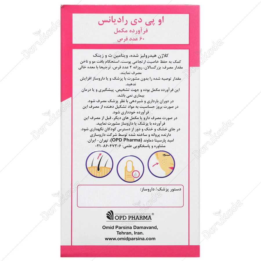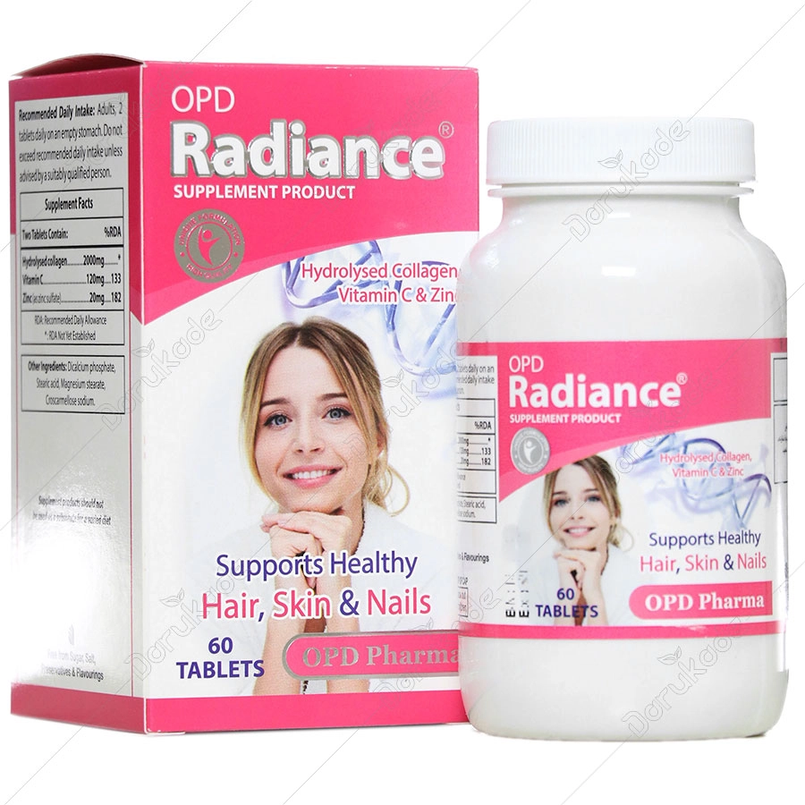 قرص او پی دی رادیانس، حاوی کلاژن هیدرولیزشده، ویتامین C و زینک به فرم زینک سولفات