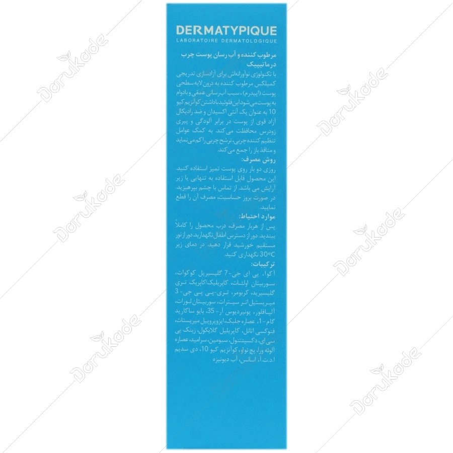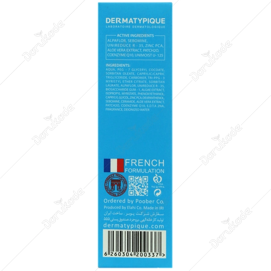 مرطوب کننده و آبرسان پوست چرب درماتیپیک با تکنولوژی نوآورانه اش برای آزادسازی تدریجی کمپلکس مرطوب کننده به درون لایه سطحی پوست (اپیدرم)، سبب آبرسانی عمقی و بادوام به پوست می شود. این فلوئید با داشتن کوآنزیم کیو 10 به عنوان یک آنتی اکسیدان و ضد رادیکال آزاد قوی از پوست در برابر آلودگی و پیری زودرس محافظت می کند. به کمک عوامل تنظیم کننده چربی، ترشح چربی را کم می نماید و منافذ باز را جمع می کند.