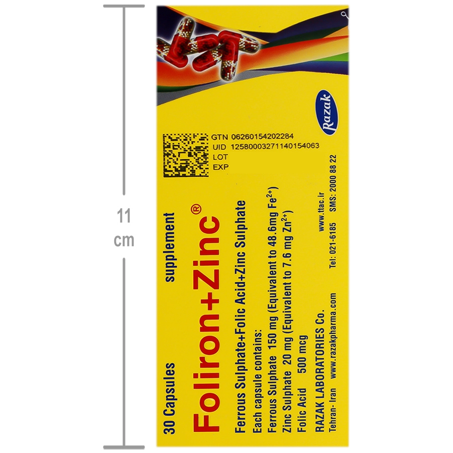هشدارها و احتیاطات: - در صورت مصرف فرآورده دارویی دیگر قبل از مصرف با پزشک و یا داروساز مشورت شود. - وجود هر نوع حساسیت به آهن، فولیک اسید، روی و یا موادی مانند غذاها، رنگ ها و یا مواد محافظ با پزشک و یا داروساز مشورت شود.